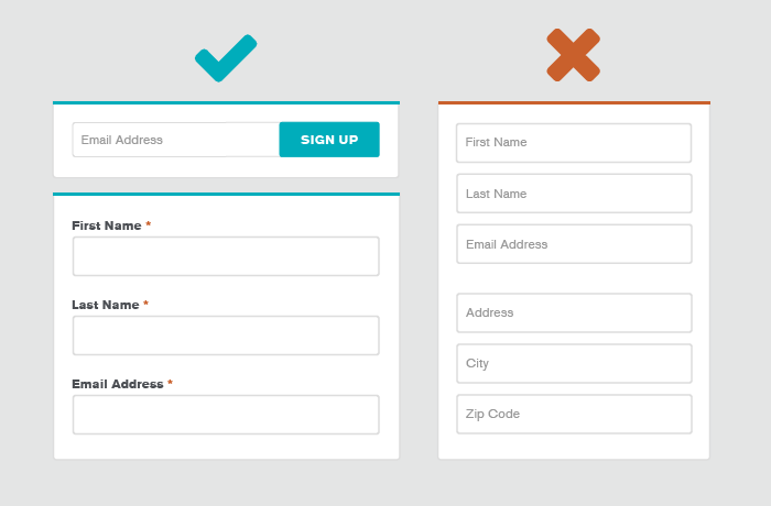 When considering what fields to include in your form, less is always more. Simplicity is key when asking for information; otherwise users feel overwhelmed or like you’re asking for too much or invading their privacy.