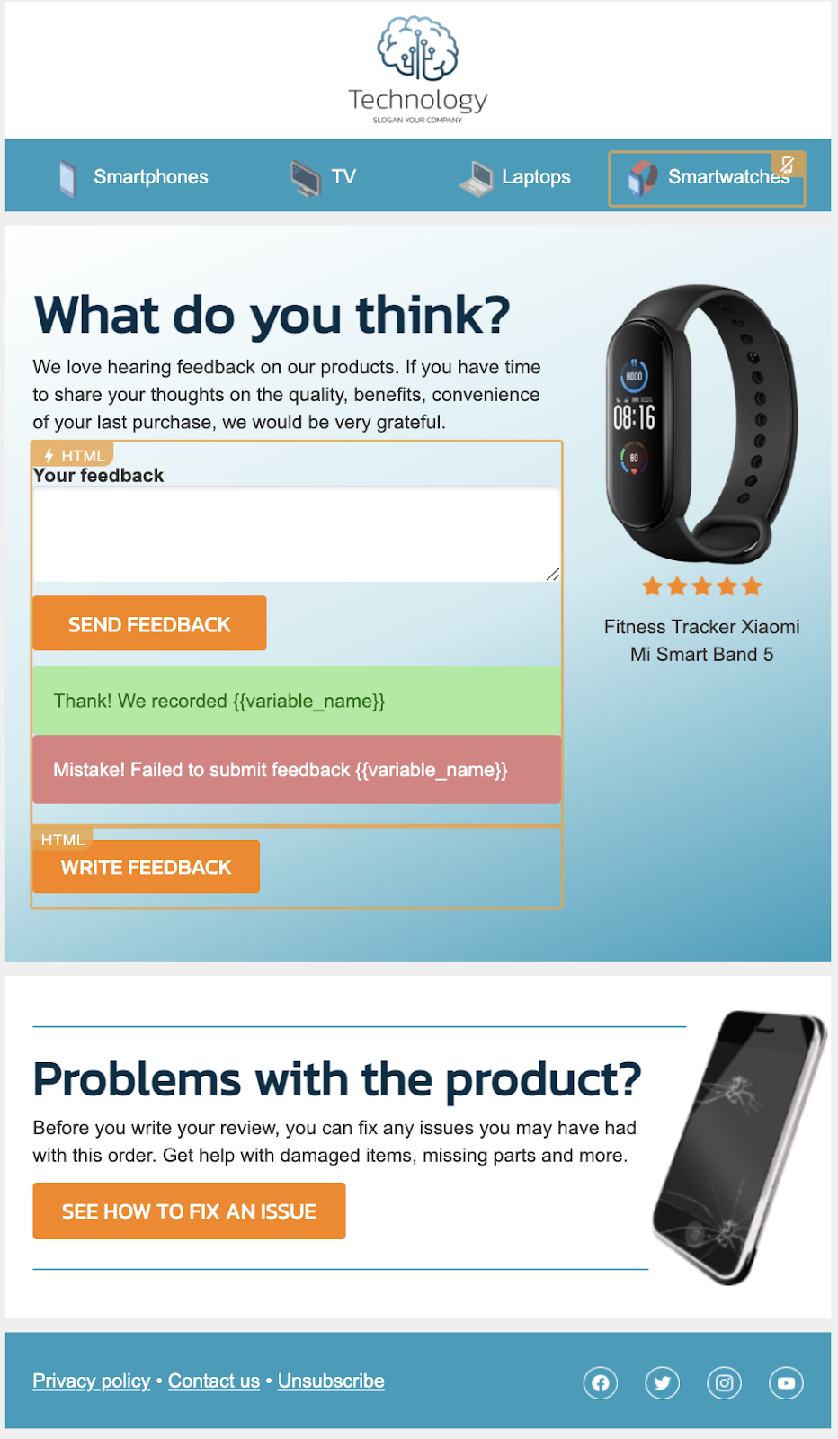 Stripo’s Retargeting templates are highly interactive and include opportunities for recipients to provide feedback and engage with what you’re sending out. This is a great way to foster a relationship with your audience and gain more clarity on what their priorities and concerns may be.