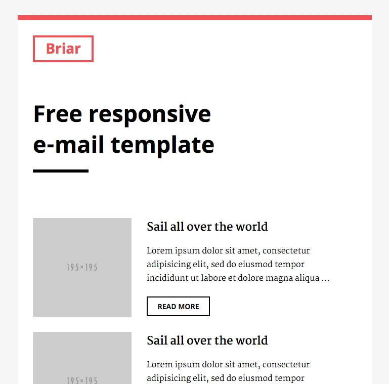 SliceJack’s Briar template is great for any business looking for a free, responsive newsletter template. Inspired by a similar WordPress theme of the same name, this template is great for any marketer looking for a sleek and minimalist design. It features a fluid layout that is great for both mobile and desktop inboxes.