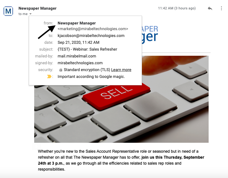 The from address or sender address, as seen in a newsletter email for Gmail, for The Newspaper Manager is marketing@mirabeltechnologies.com.