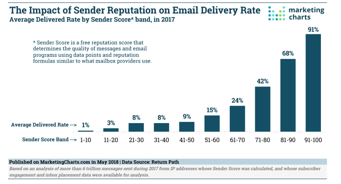 Return Path (now Everest), an email optimization and deliverability product by Validity, analyzed more than 6 trillion email messages sent in 2017 from IP addresses whose sender reputations were calculated and whose engagement and inbox placement data was available. The 2018 report determined that the higher sender scores led to better email deliverability rates: