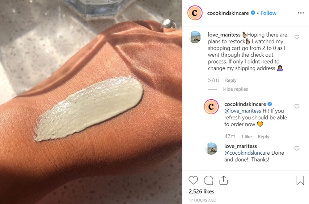 - Instagram. A great way to boost customer service is to monitor Instagram comments. It’s quick and easy, and many users are accustomed to doing it for personal use … with an instant response. Take this brand loyalty example from Cocokind Skincare: