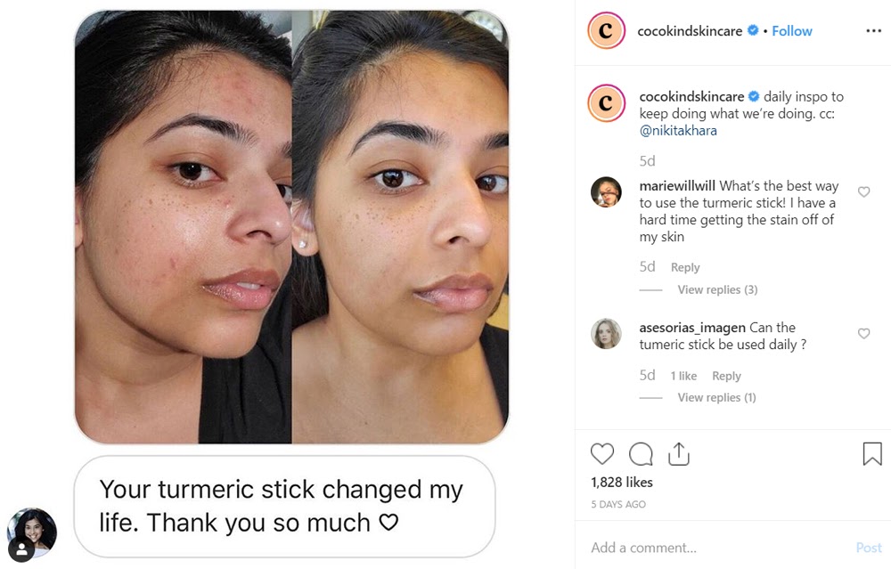This particular post shares the before-and-after of a customer using the brand’s Turmeric Spot Treatment stick on her skin. Cocokind leveraged this review to show followers and potential customers that their products work.