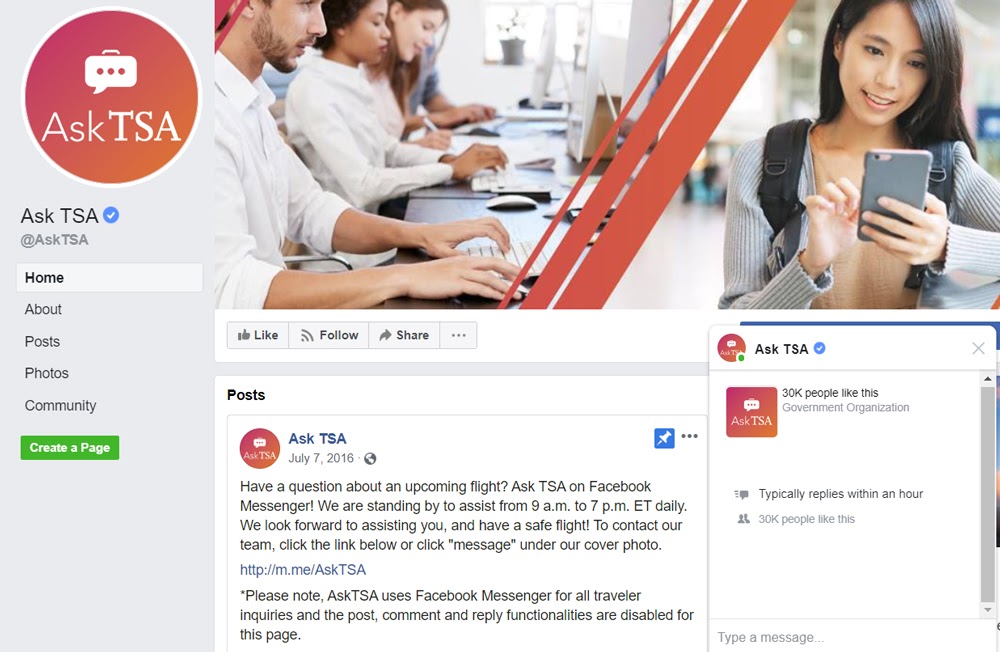 Even the TSA offers Facebook Messenger, so you can ask an agent anything before takeoff. Get flight changes, send FAQs, and more.