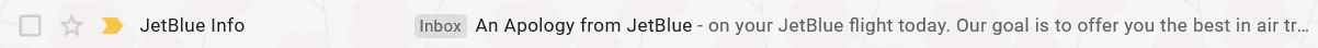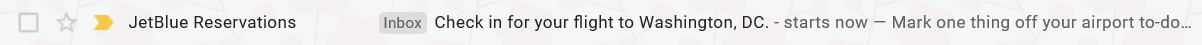 Notice how regular marketing emails come from “JetBlue,” while a message directly related to my flight comes from “JetBlue Reservations” and a customer experience communication comes from “JetBlue Info.” (Also, those yellow arrows? That’s my inbox provider, Gmail, letting me know these emails are important because I often open emails with that label or sender name.)