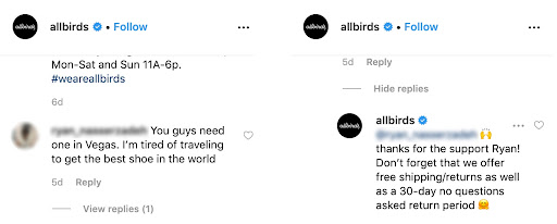 Allbirds is a sustainable shoe company that makes shoes out of wool to be especially comfortable. The customer service they offer through social media is uncanny.