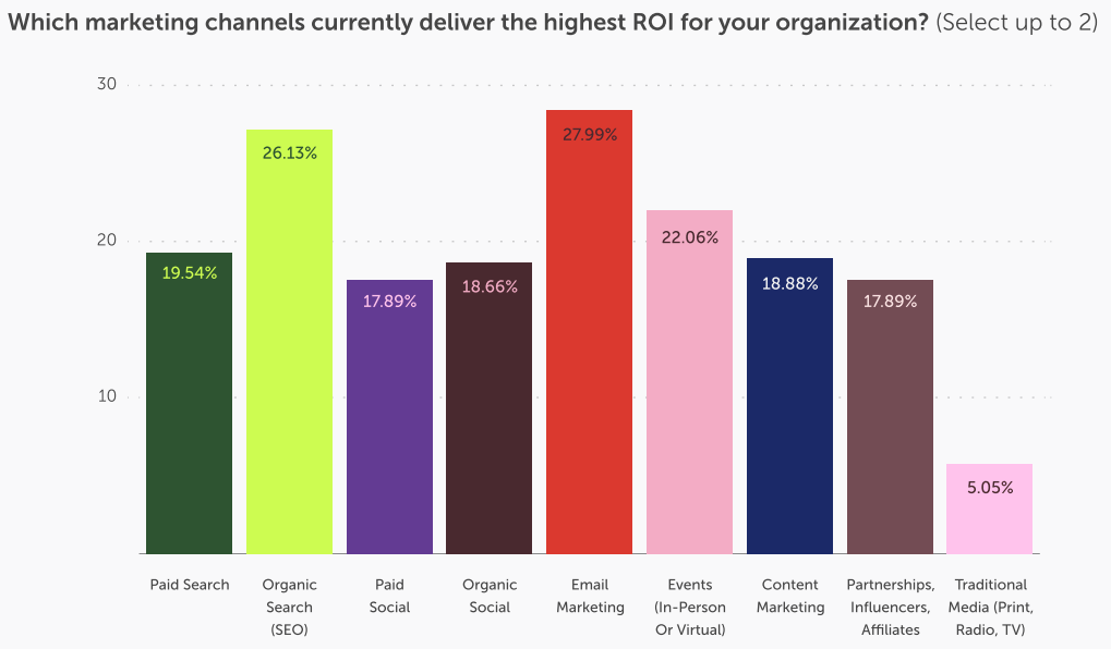 More than a quarter (27.99%) said email marketing created their highest ROI, ahead of SEO (26.13%), events (22.06%), and paid search (19.54%). And for nearly half (48.19%), lead generation is the top priority for 2026.