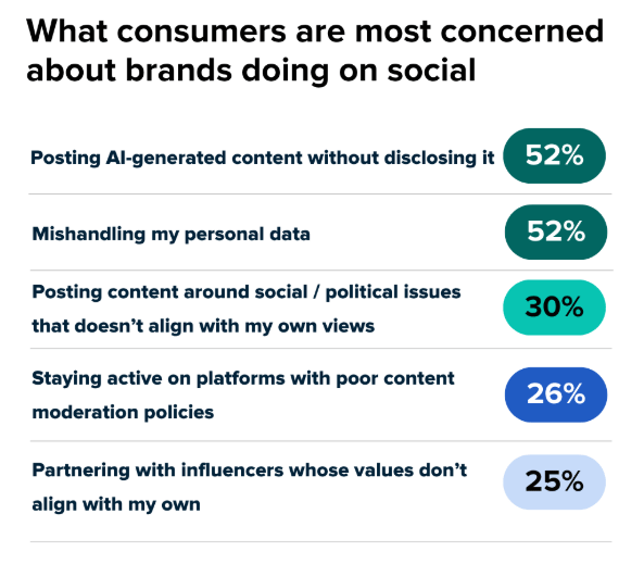 For brands marketing on social media, Sprout Social recently asked consumers what brand-behavior they were most concerned about, finding that undisclosed AI-generated content and mishandled personal data were top concerns.