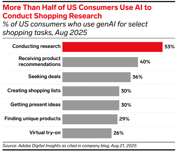 The most popular tasks that shoppers are utilizing AI for include conducting research (53%), recommendations (40%), and seeking deals (36%).