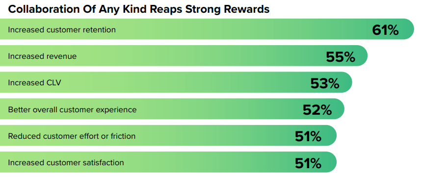 The benefits of that collaboration between customer service, customer experience, and marketing are simply too essential to ignore, including increased customer retention (61%), increased revenue (55%), and increased customer lifetime value (53%).