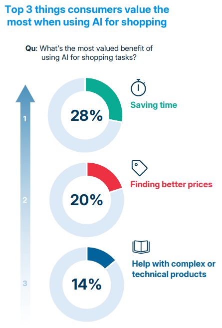 Saving time was the top benefit consumers value in using AI, followed by finding better prices and guidance with technical products. 38% of those consumers surveyed have used ChatGPT or other third-party assistants, while 34% have used AI provided by retailers on sites or apps.