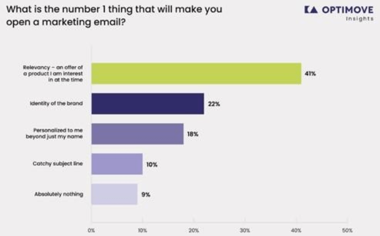 Relevance, as far as being about an offer or product that a consumer is interested in at that time, is the top factor that will inspire someone to open an email. 41% of consumers picked that No. 1, ahead of a brand’s identity (22%), personalization beyond just their name (18%), and a “catchy subject line” (10%).