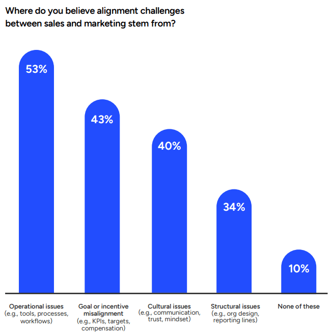 “While operational issues rank at the top for both marketing and sales, disjointed tools and workflows seem to be more of a problem for marketing teams,” the report says of the 58% of marketers and only 48% of sales professionals who blamed operational issues. “Marketers are also significantly more likely to feel that goal and incentive issues (48% vs 38%) as well as cultural issues (46% vs 36%) are main drivers of misalignment.”