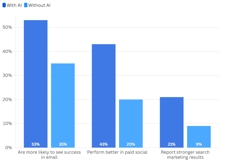 As for tools helping with that full potential, AI is clearly there, with almost half (48%) of SMBs having adopted the technology. Those that are using AI for such tasks as writing emails or subject lines are more likely to see success in email (53%, to 35% without AI) as well as reporting stronger search marketing results (21% with AI to 9% without AI).