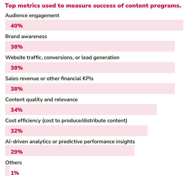 Canto asked content professionals how they evaluated success of these growing programs, finding 40% using audience engagement as their leading metric, followed by brand awareness (38%), web traffic or lead generation (38%), and sales revenue (also 38%).