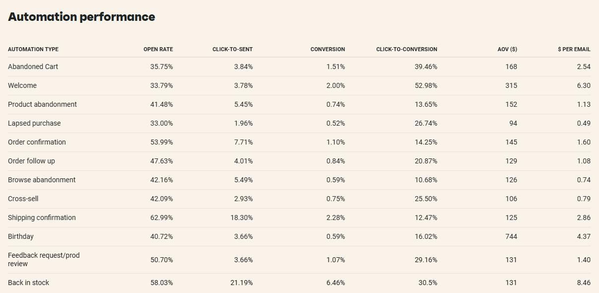“Nearly one in three clicks on an automated email resulted in a purchase, making them some of the strongest buying signals across channels,” says the report about particular successful automation workflows that included abandoned carts, welcome messages, back-in-stock emails, and birthday messages.