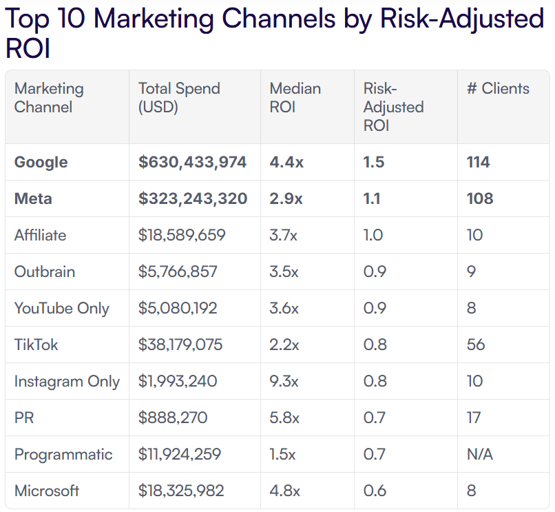 “When ranked by highest risk-adjusted ROI, the results are vastly different,” says Cassandra’s report, which brings marketing channels like Google (4.4x median ROI) and Meta (2.9x median ROI) back to the top as more-often used and “safer places to invest your marketing dollars.”