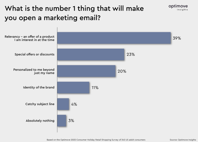 Optimove found that offer-relevancy was the top reason for consumers to open an email (39%), followed by discounts (23%), and personalization (20%).