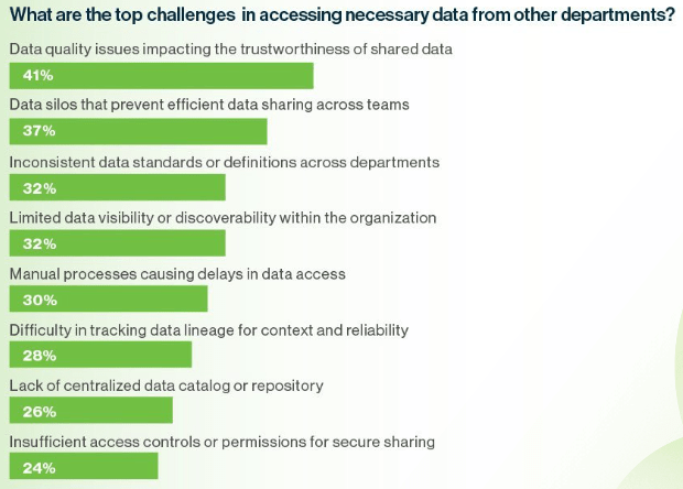 41% said the top challenge in accessing interdepartmental data are issues around data quality and how that impacts trustworthiness. 37% said data silos, 32% said inconsistent standards, and 32% said limited data visibility.