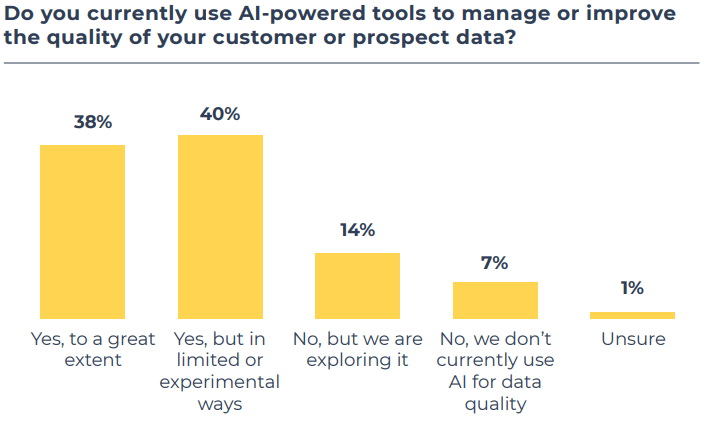 Data diversification from sources that help give “real-time, actionable insights” is seen as one way to overcome these hurdles. Of course, AI tools are quickly growing as a go-to resource to help manage data as well. 38% are already using AI tools to manage or improve customer data “to a great extent,” while 40% are using them in a limited or experimental fashion.