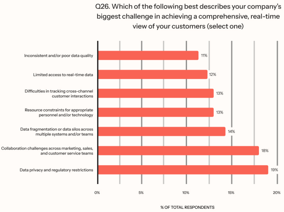 In addition, 14% blame data silos as their biggest barrier to comprehensive, real-time views of their customers. Those brands with aligned and integrated silos, on the other hand, saw “major gains in performance, satisfaction, and profitability,” including being 156% more likely to exceed their marketing goals.