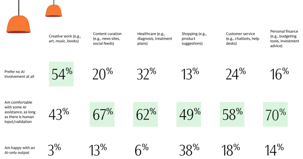 Most were comfortable with AI assistance for content curation, customer service, shopping, personal finance, and healthcare; only the category of “creative work” saw a majority preferring no AI involvement whatsoever.