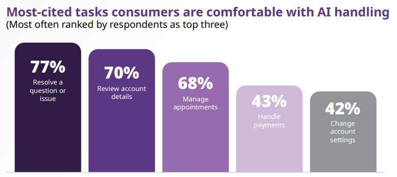 As for tasks that consumers are most comfortable with AI handling, 77% said resolving a question or issue, 70% said reviewing account details, and 68% said appointment management.