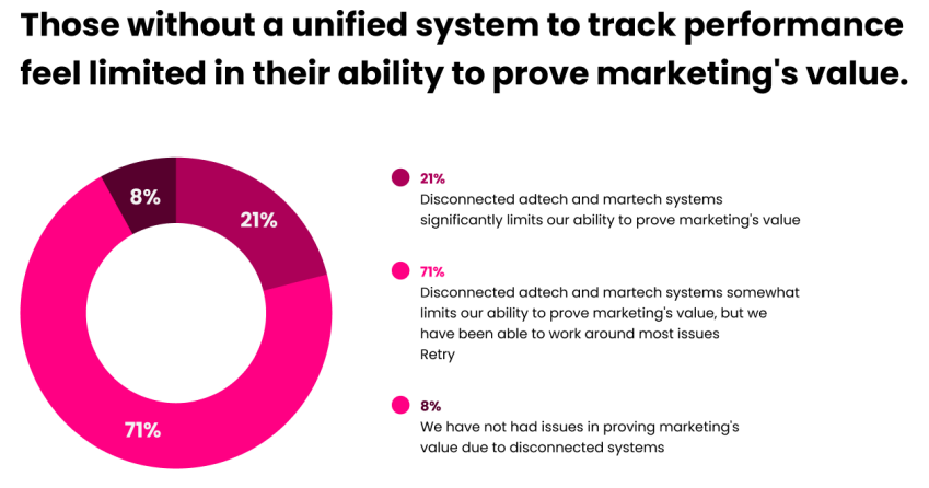 More than 9 in 10 marketers (92%) said disconnected tech limits their ability in some capacity to demonstrate value, with 21% categorizing those limits as “significant.”